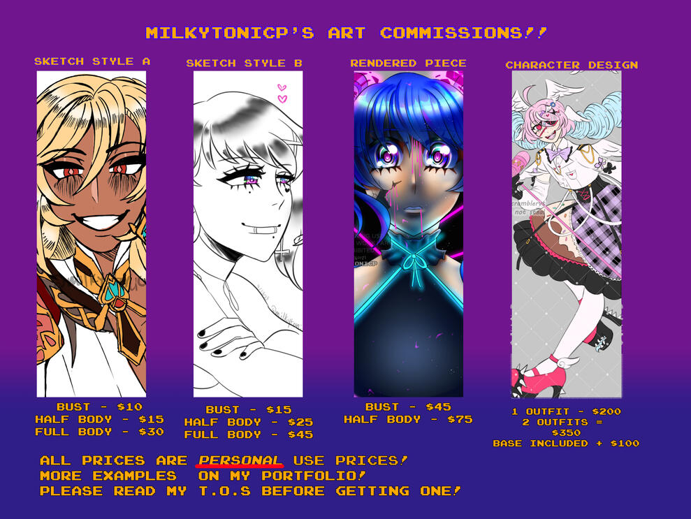 They'll be sent as invoices!➔ All commissions are for PERSONAL USE only unless we discuss other wise. If you need art for commercial we can discuss such and I will make you a custom commission slot on ko-fi for such a thing. Do not use my art for NFTs or anything like it.➔ After payment your commission cannot be cancelled under any circumstances.--➔ TAT